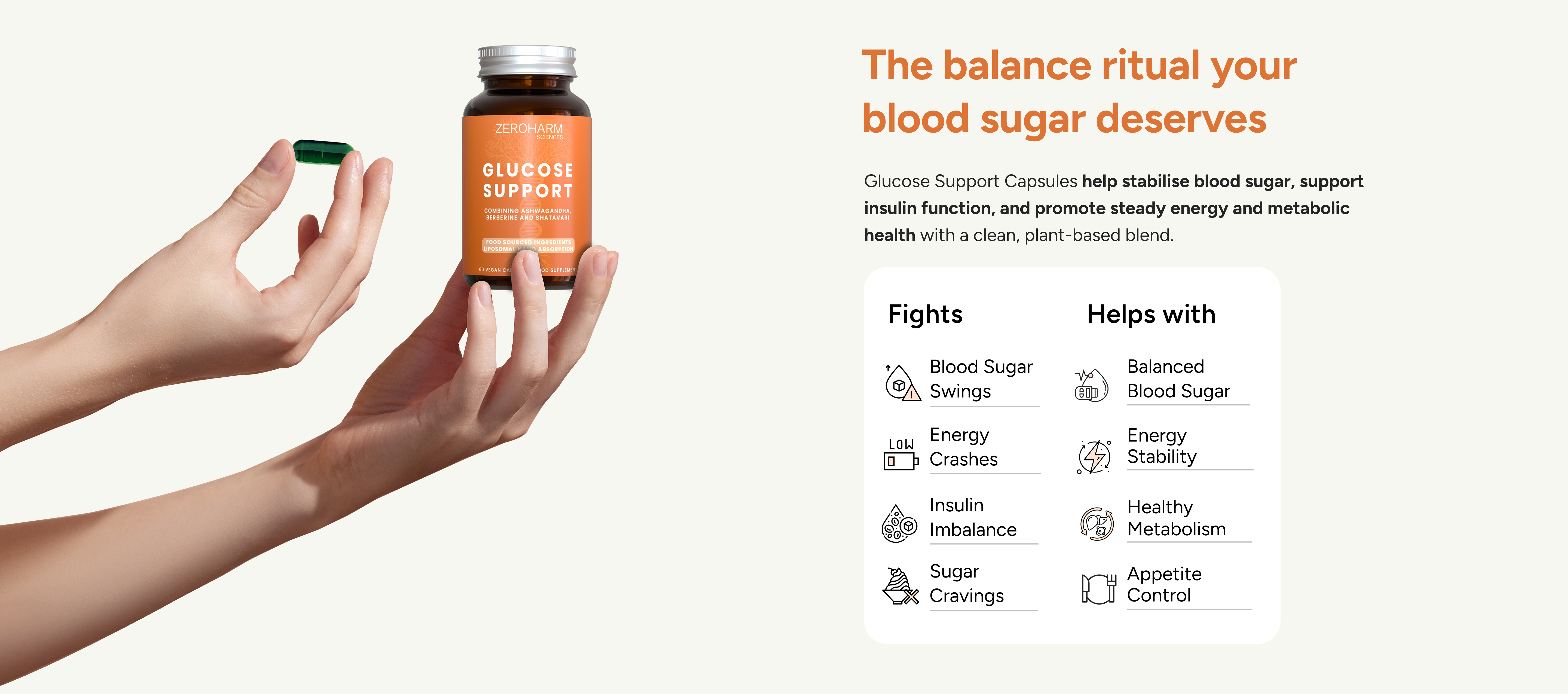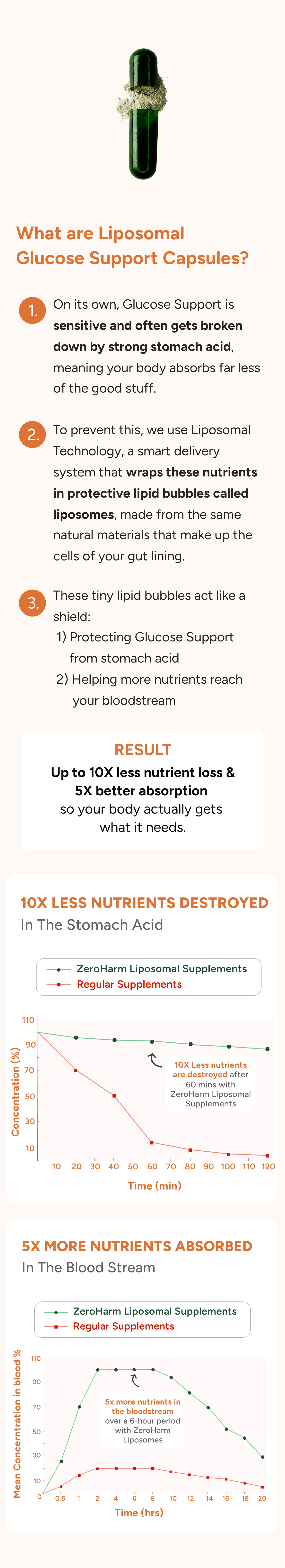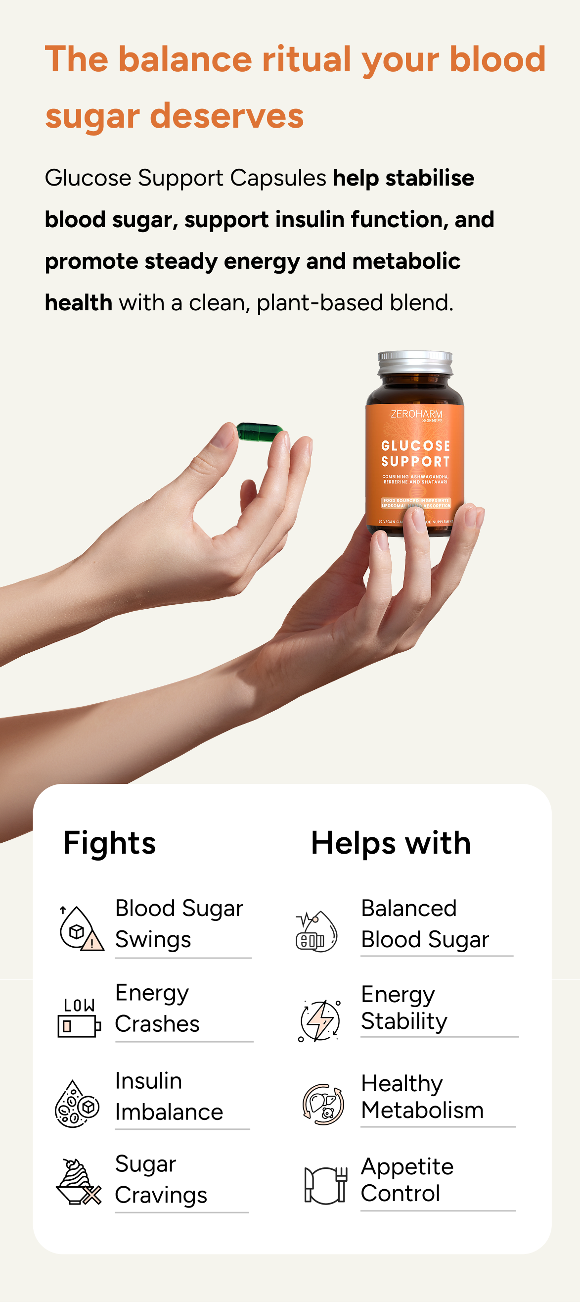 Glucose Support combines Black Plum, Shatavari, Ashwagandha, and Berberine to help regulate blood sugar levels, improve energy, and support overall health.