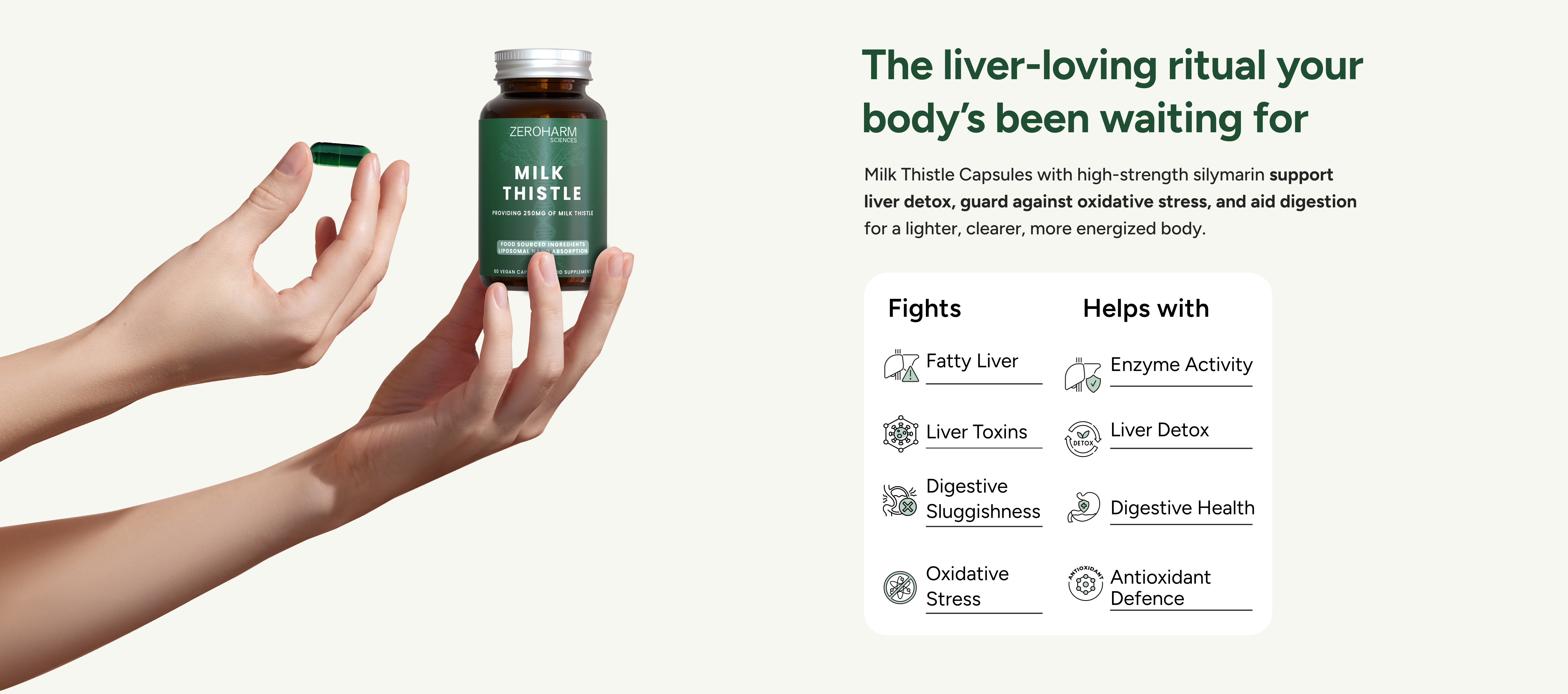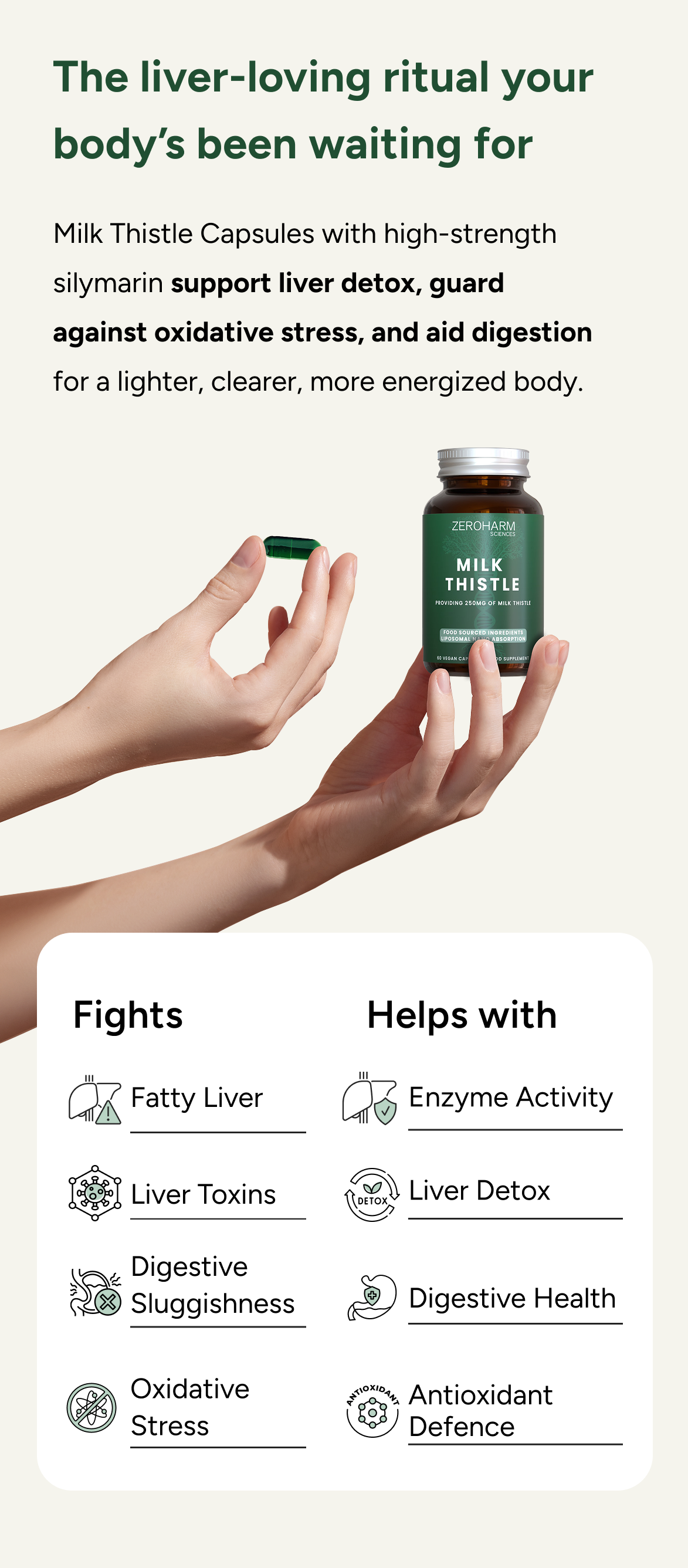 Milk Thistle is a potent herb known for supporting liver health, detoxification, and protecting liver cells from damage. It helps promote liver regeneration and enhances digestive health.