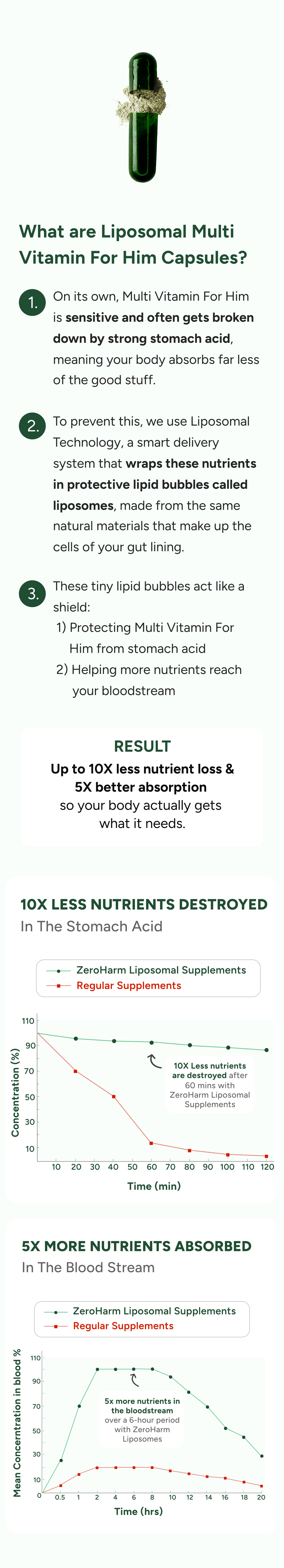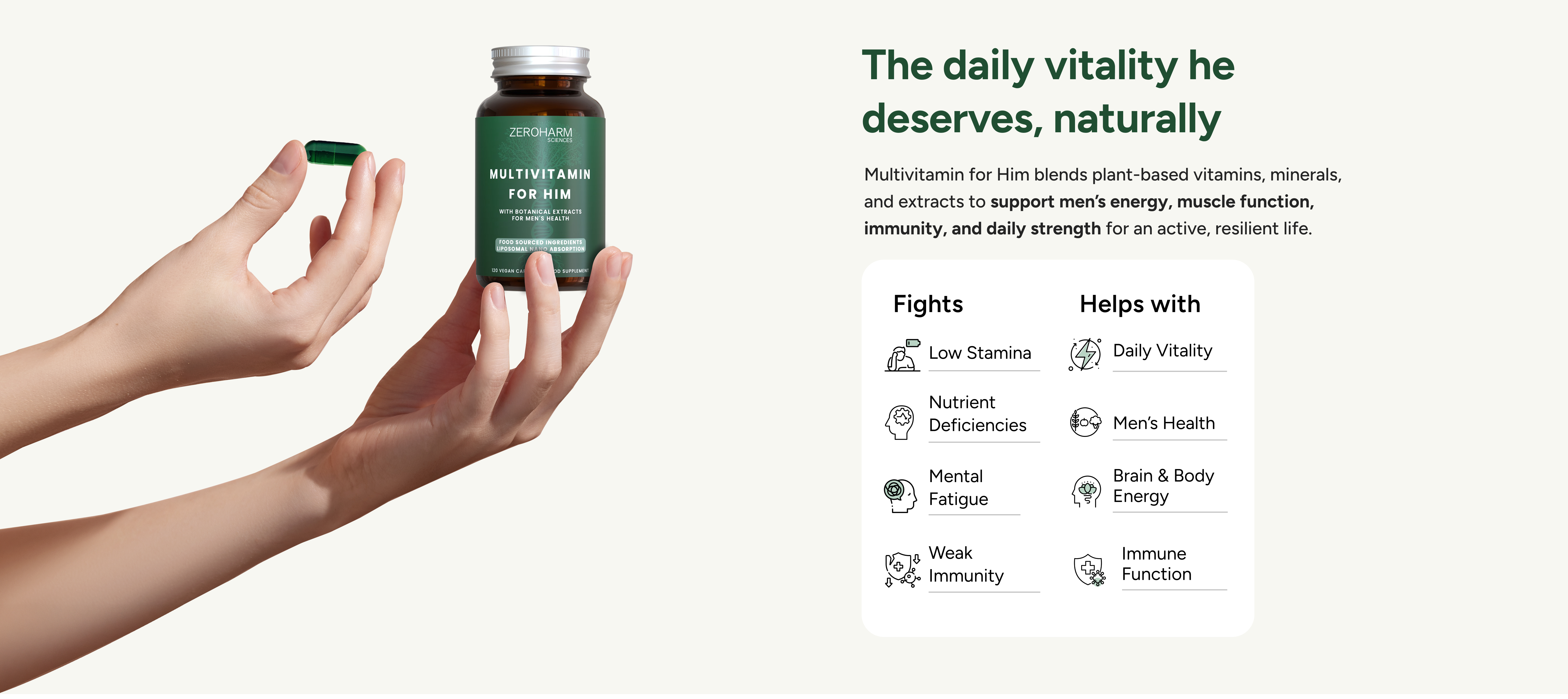 Multivitamin for Him is a targeted supplement formulated with essential nutrients, vitamins, and botanical extracts to support men’s health, enhance energy levels, and boost immunity.