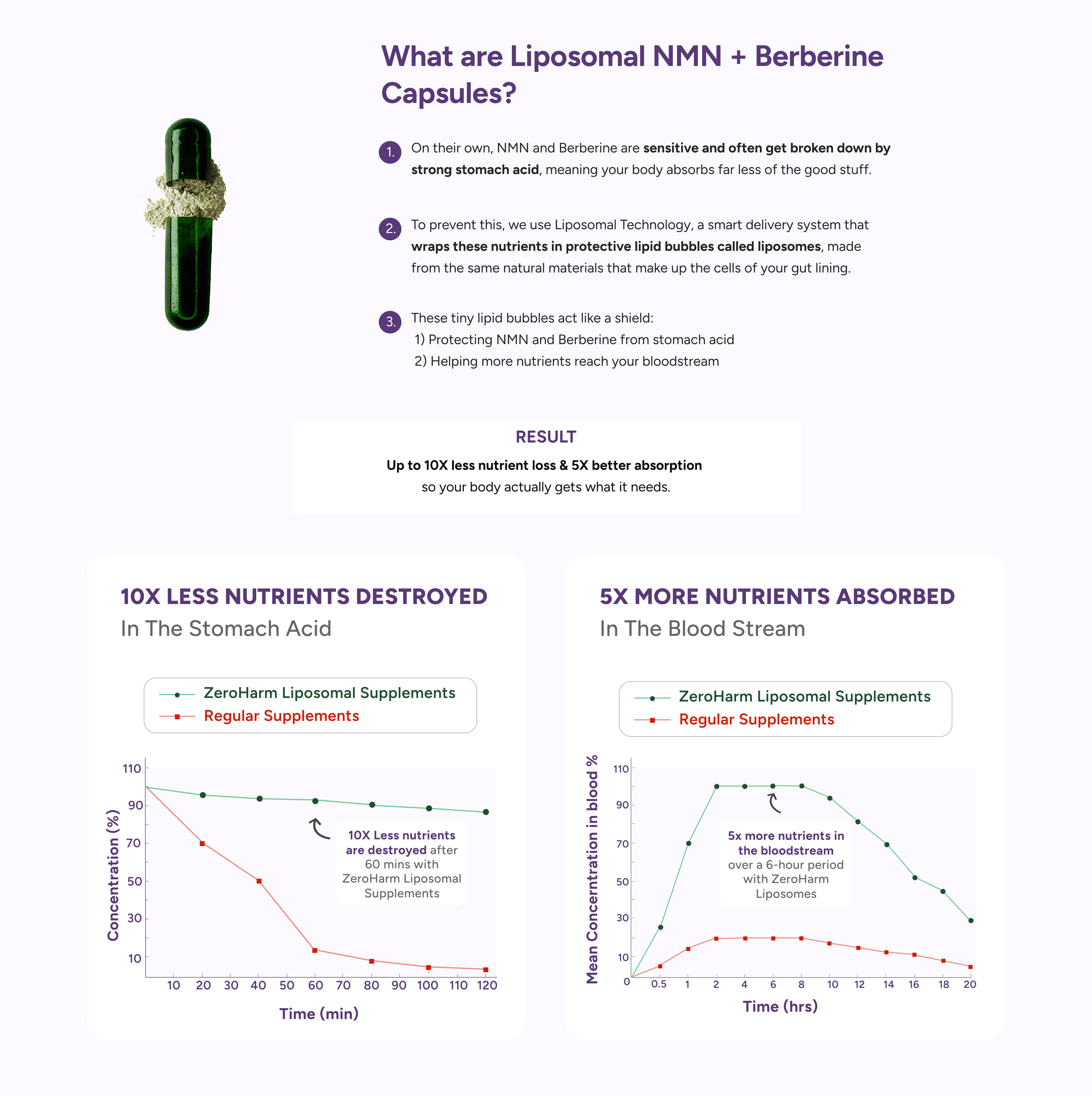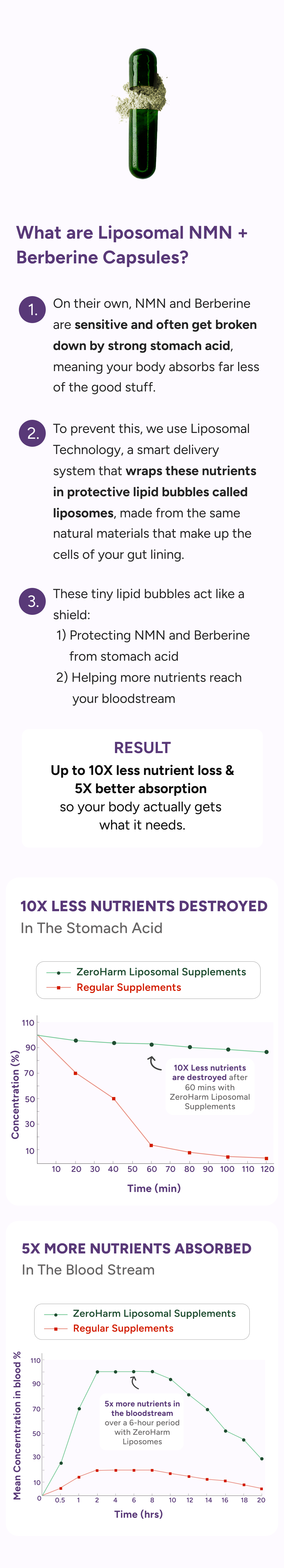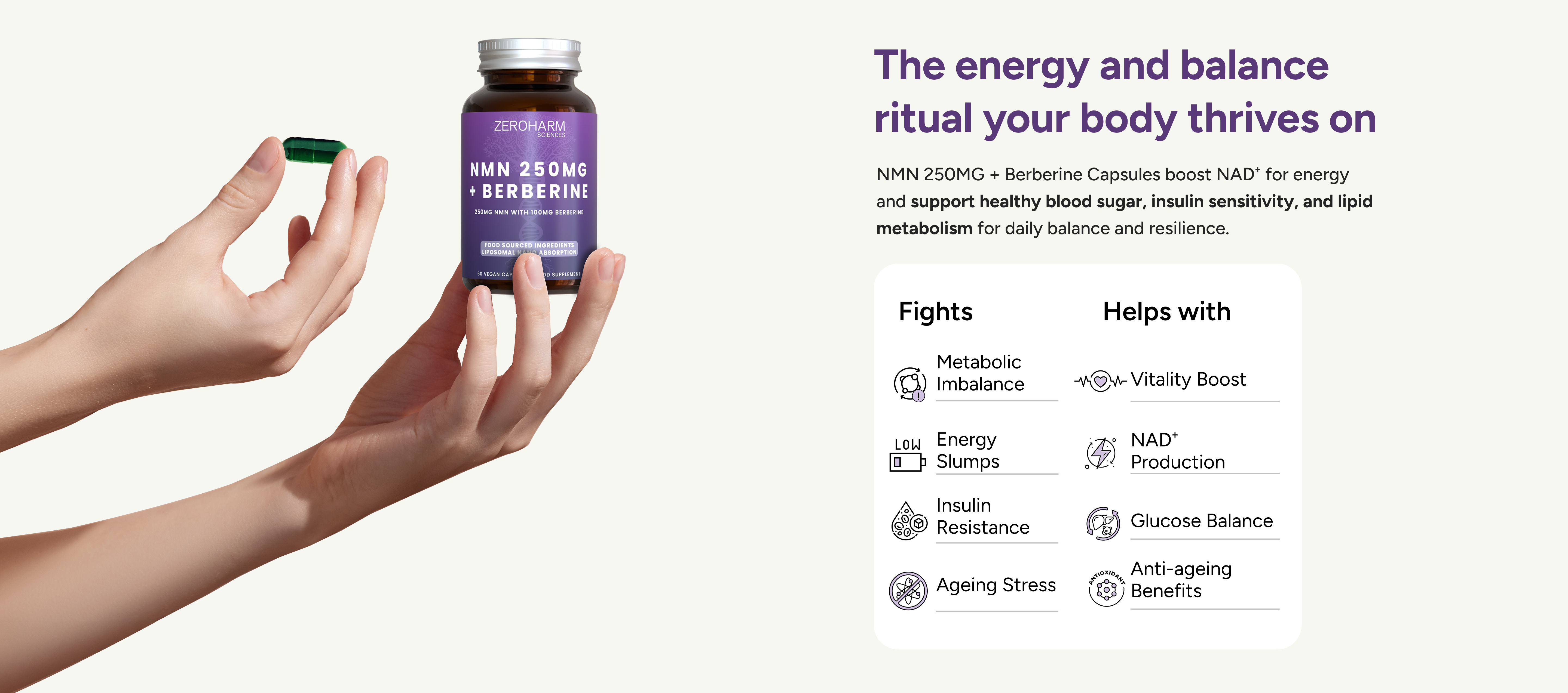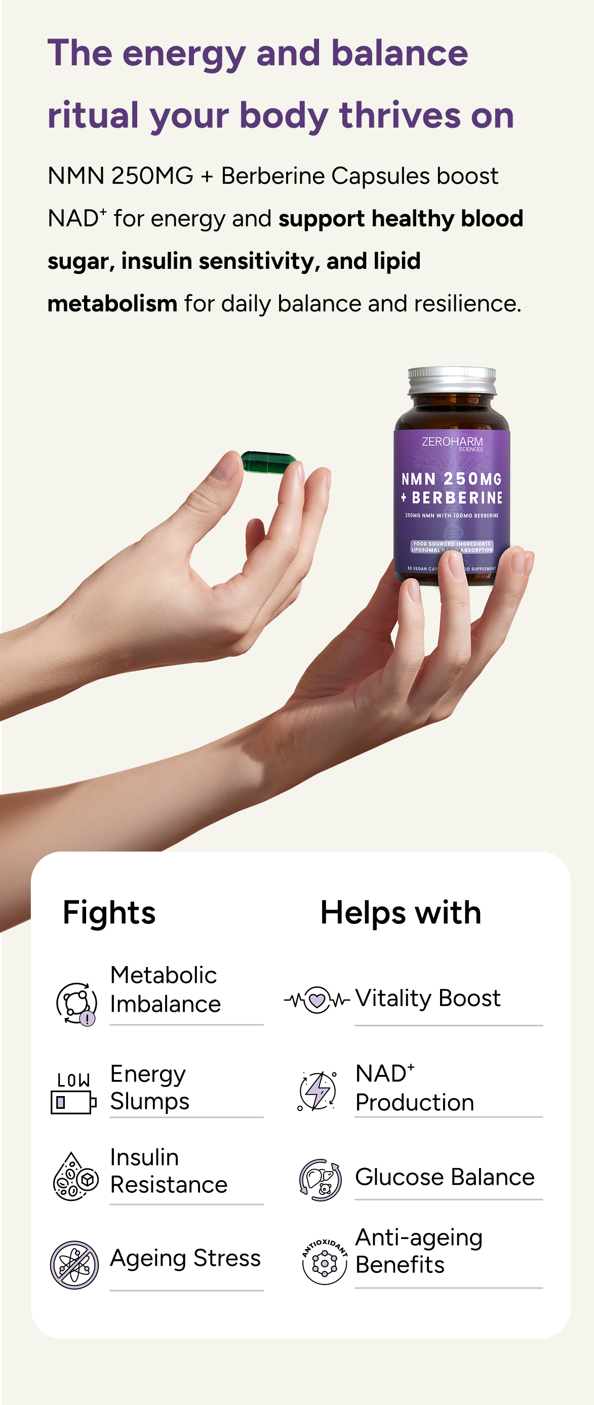 NMN + Berberine is a supplement combining NMN, which supports energy production and longevity, with Berberine, which helps regulate blood sugar and improve metabolic function.