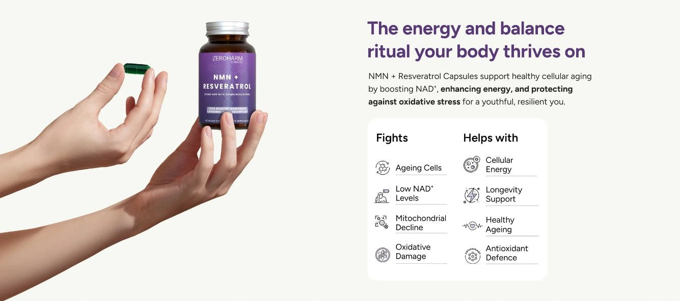NMN + Resveratrol is a supplement that combines the benefits of NMN for cellular energy and Resveratrol for antioxidant protection, supporting healthy aging and overall vitality.