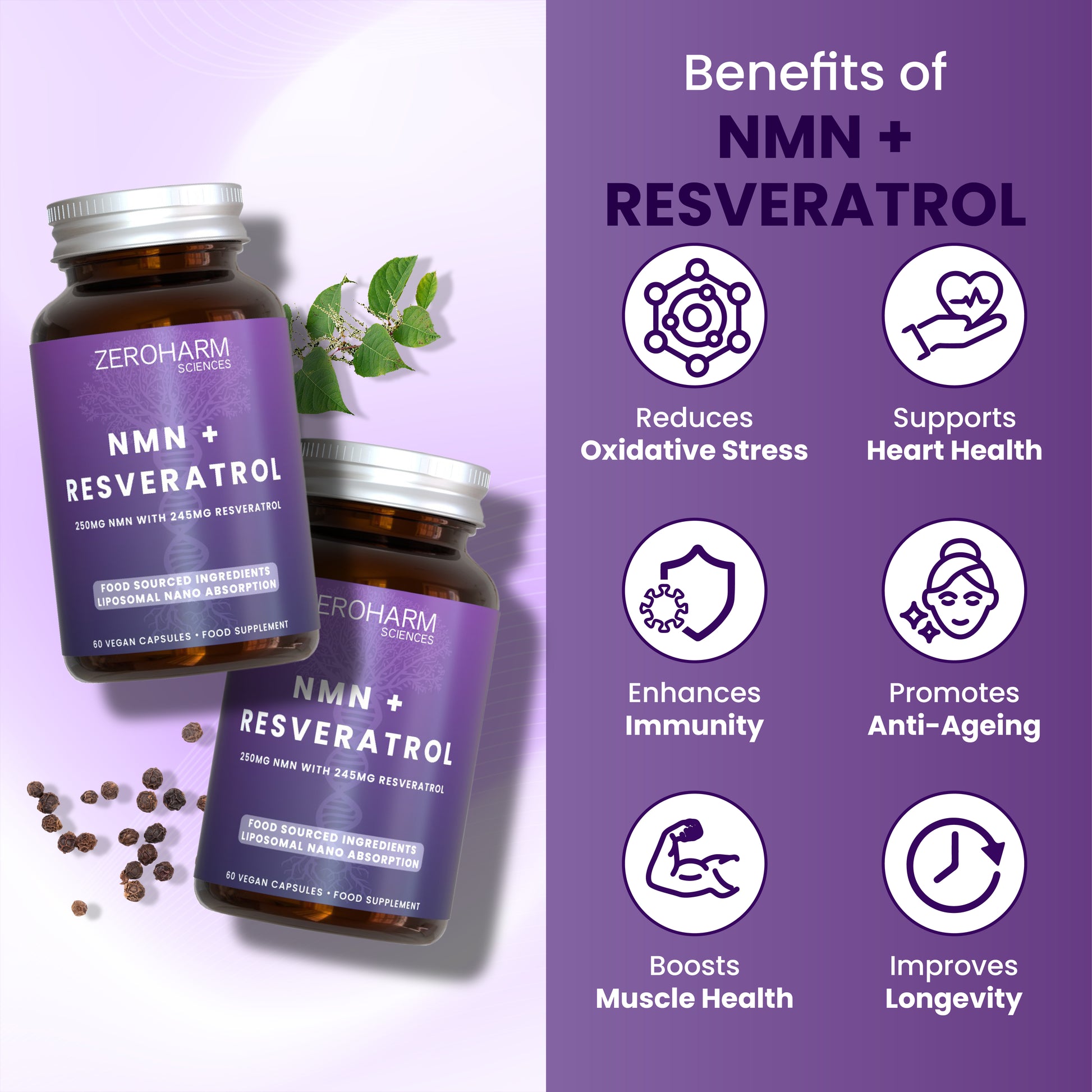 Piperine enhances the bioavailability and absorption of nutrients, allowing your body to more effectively utilize NMN and Resveratrol for optimal health benefits.